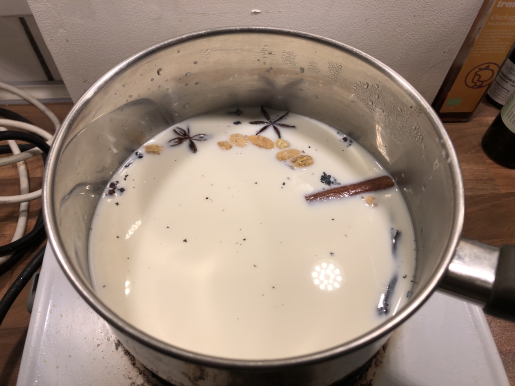 Mælk og fløde varmes op til kogepunktet sammen med alle krydderierne. Sørg for at åbne vaniljestangen og skrabe vaniljekornene ned i mælken. Stangen skal også koges med. Stjerneanis, kanelstænger og nelliker kommes hele i mælken og kardemommekapslerne åbnes først. Det er en god idé at røre i mælken under opvarmningen, så mælken ikke stødkoger. Imens piskes æggeblommerne med sukker og honning og evt. en lille teskefuld johannesbrødkernemel, som vil få isen til at blive fløjlsblød.